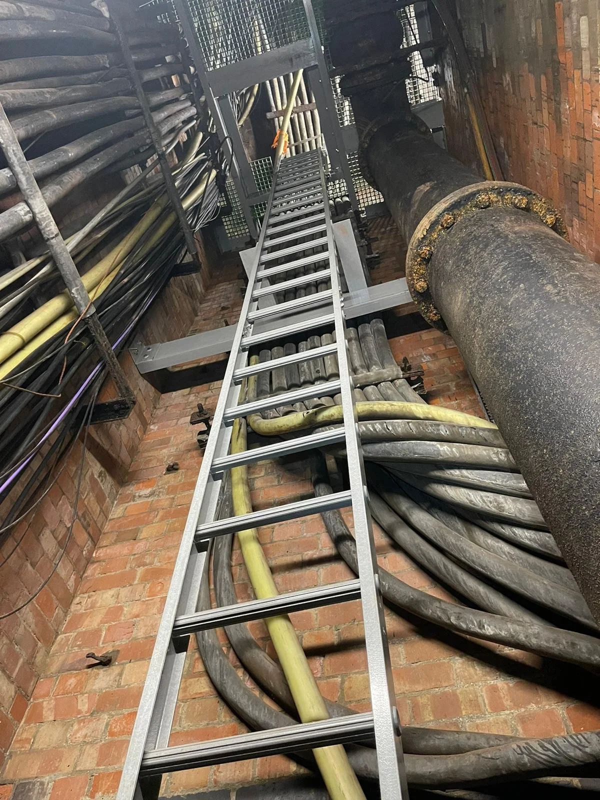 In the summer of 2024, SFH Maintenance worked to replace an old and corroded ladder and platform within a confined space. With the area surrounding the existing platform being open to a fall risk, the 7m fall was secured with a GRP grated flooring covering the entirety of the clear opening. The increased floor coverage also ensures safety whilst descending or ascending the new ladder, with the option to install a tripod and winch at the top to ensure safe use. A lift up panel gives access to the ladder opening. The ladder was finished with a pull up safety stay handle.